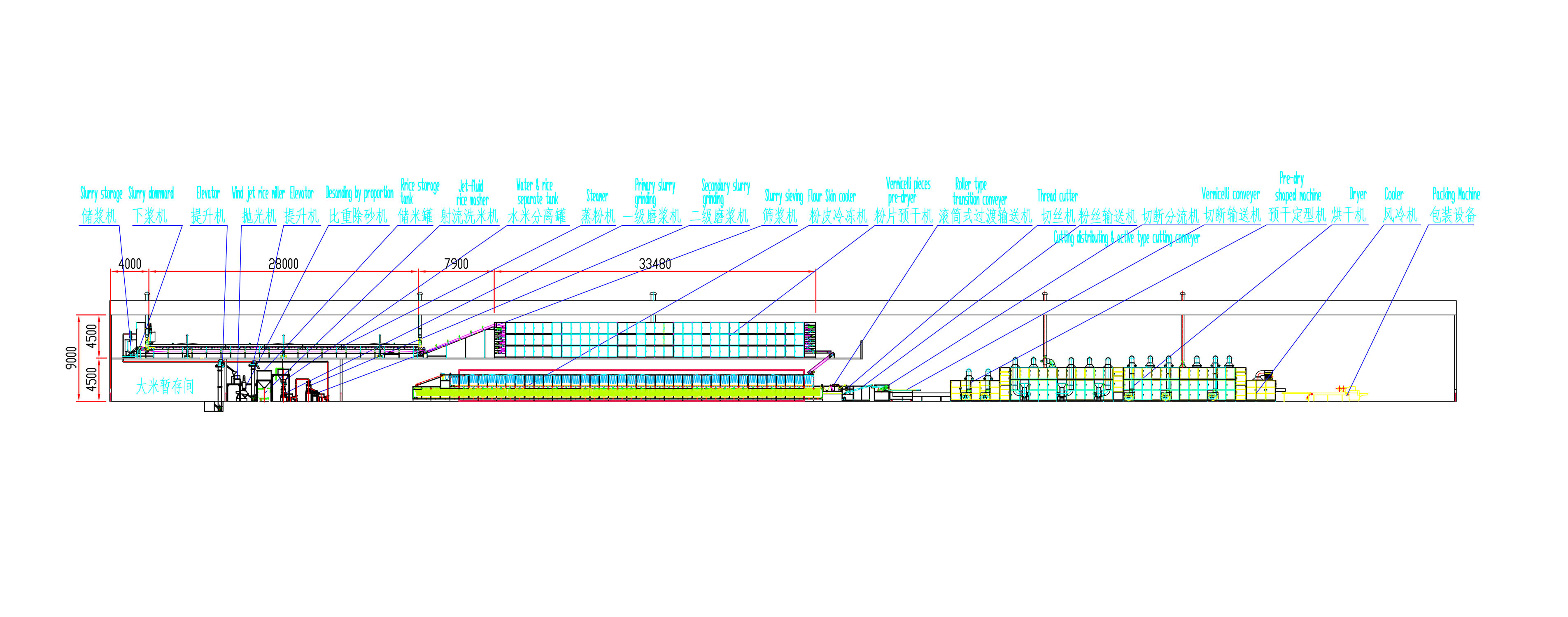 - Hygiene and environmental protection: Less dust is collected and processed, less waste water and steam are collected and discharged, and the process of “pipe, trough, bucket, belt, box” and other processes are automatically sent and received. With the automatic operating system, it is a real realization for entire production line continuous automatic control from raw materials dry powder proportioning to product aseptic packaging! It overcomes the phenomenon of long-term “static aging” or even “overnight aging” in the traditional processing technology, which causes the vermicelli enzymes to become rancid.