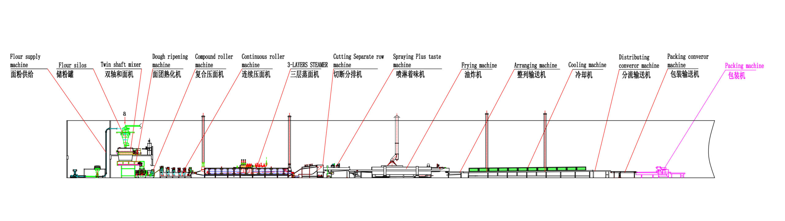 A full line includes: flour siever, pneumatic conveyor, liquid/powder mixer, atmospheric/vacuum dough mixer, dough maturer, compound/vacuum sheeting, dough sheet maturer, continuous sheeting, strip cutter/length fixer/hanger, hanging conveyor, moving dryer, auto unhanger, pre-cut conveyor, multi-blade cutter, noodle packer, case packer & broken noodle recycler.